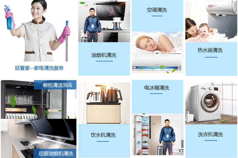廷管家服務項目包含油煙機清洗、空調清洗、熱水器清洗、飲水機清洗等多項家電清洗業(yè)務,安全便捷又放心!